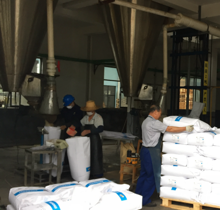 目前各染料生產(chǎn)企業(yè),在成品包裝過程中,基本上使用的是袋包裝或箱裝兩種規(guī)格,袋包裝形式為:編織袋內(nèi)襯PE塑料袋。箱裝形式為:紙箱內(nèi)襯PE塑料袋。目前企業(yè)普遍使用人工進行稱重包裝,從放料口開始接料,到放完后進行復秤及后道的扎袋、封箱(編織袋縫口)、堆碼等,各個工序均有人工處理完成,一般情況下,按照簡易化的生產(chǎn)流程,一個放料口的生產(chǎn)班組約為3~5人(見圖一)。一般情況下至少有兩個班組在生產(chǎn)(如龍盛、閏土、吉華等這些行業(yè)內(nèi)大企業(yè),基本上極少有10個以上的班組在生產(chǎn))。企業(yè)的用工量極大,與此同時,當前的包裝工人普遍年齡在四五十歲以上,對于環(huán)境差、有污染的生產(chǎn)場所(見圖二),年輕人員基本上是趨之若鶩,因此隨著企業(yè)招工難度大、用工成本的普遍上漲以及企業(yè)對成品稱重包裝精度與合格率的不斷提升,一體化機械智能包裝已經(jīng)是一種趨勢所向,同時國家也在大力整理各項化工企業(yè)的污染問題,因此,一種智能化的機械包裝整體工程設(shè)備即將會使得各染料化工企業(yè)作為技術(shù)整改的標準所需。